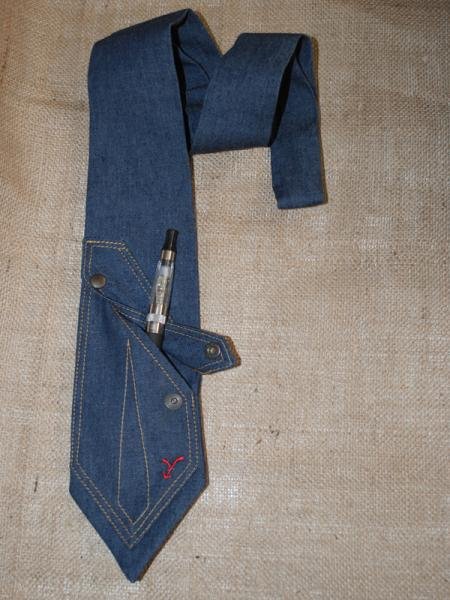 Cravatta in Denim, creazione coperta da brevetto. Il modello presenta un taschino con pattina abbottonata che lo rende unico nel suo genere e che si presta, oltre agli innumerevoli utilizzi, anche come sfizioso e utile porta sigaretta elettronica o anche come porta gioielli “d’emergenza”. Realizzata completamente a mano in solo otto esemplari.Questa creazione esula dagli standard e tendenze del momento.Ogni dimensione è studiata per esaltare l’unicità (angoli accentuati e larghezza della pala).